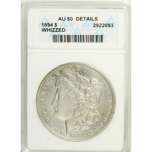 <B>1894 S$1 --Whizzed--ANACS. AU50 Details.</B></I> A softly struck example that has minor wear and opaque olive-gray haze over most of the surfaces. A few light abrasions are present in the porous and unnaturally lustrous fields.<BR><BR><b>Shipping:</b> Coin/Currency (<a target="_blank" href="http://www.heritageauctions.com/common/shipping.php">view shipping information</a>)