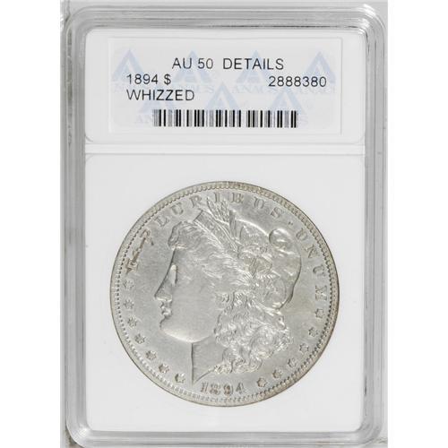 <B>1894<img border='0' src='http://www.heritagecoins.com/images/star.gif' width=10 height=10>$1>--Whizzed--ANACS. AU50 Details.</B></I> The battleship-gray obverse displays telltale granularity when viewed beneath a strong lens. The partly lustrous reverse is more attractive, and displays light peripheral golden-brown toning.