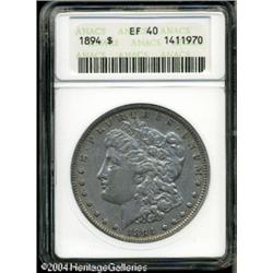 1894 S$1 XF40 ANACS. Glimpses of luster illuminate <B>1894 S$1 XF40 ANACS.</B></I> Glimpses of luster illuminate recessed areas of this moderately circulated tan-gray rare date Dollar. A few handling marks on the cheek and a tick on the upper obverse are not especially conspicuous. <BR><BR><B>Important notice:</B> Heritage usually auctions material at the rate of 200-250 lots per hour. On some occasions eBay Live bid software or the Internet may not be able to keep up with the pace of the auction. We recommend placing a realistic absentee bid now as insurance to avoid disappointment. Occasionally the auctioneer may eliminate or reject an eBay Live bid, and the auctioneer may also reopen a lot after the close of the eBay live bidding (usually because we missed an audience bid), and may reject your bid even if it shows you as the winning bidder. By bidding via eBay Live, you agree that Heritage may award the lot to another bidder at its sole discretion under the circumstances described above or any other reasonable circumstances. Since eBay bids are not shown to us until we open the lot on the floor, we treat those bids just like floor bids. In most cases the floor responds before the eBay bid is presented to us, due to Internet lag time, so for consistency we have made it a policy that floor bids are always considered first over tie eBay live bids. Also please note that all Heritage lots purchased through eBay Live carry a 20% Buyer's Premium. Please make sure you read the Terms and Conditions before you bid. This lot is being auctioned in conjunction with a live floor auction by Heritage Galleries & Auctioneers. All final auction and invoice information will be supplied by Heritage Galleries & Auctioneers, and all other information should be considered preliminary. Lot:7654