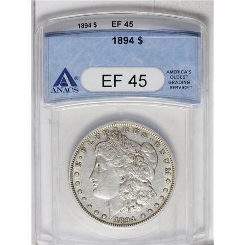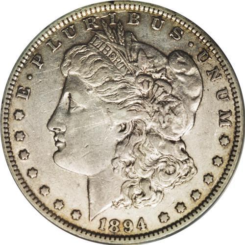 <B>1894<img border='0' src='http://www.heritagecoins.com/images/star.gif' width=10 height=10>$1> XF45 ANACS.</B></I> A Choice XF piece that has some vestiges of its original luster in the protected areas. The gray-gold surfaces, worn in a highpoint pattern, have some long abrasions, including a few on the cheek, but these have less impact on the eye appeal than one might expect. With just 110,972 coins struck, this issue has the lowest mintage of any Philadelphia Mint Morgan dollar, except for the legendary 1895.
