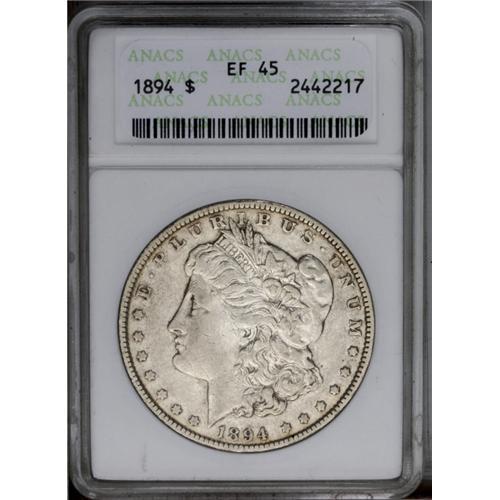<B>1894<img border='0' src='http://www.heritagecoins.com/images/star.gif' width=10 height=10>$1> XF45 ANACS.</B></I> Satiny and near-brilliant with claims to AU, particularly on the reverse. An affordable, lightly worn example of this low-mintage scarcity. <BR><BR><B>Important notice:</B> Heritage usually auctions material at the rate of 200-250 lots per hour. On some occasions eBay Live bid software or the Internet may not be able to keep up with the pace of the auction. We recommend placing a realistic absentee bid now as insurance to avoid disappointment. Occasionally the auctioneer may eliminate or reject an eBay Live bid, and the auctioneer may also reopen a lot after the close of the eBay live bidding (usually because we missed an audience bid), and may reject your bid even if it shows you as the winning bidder. By bidding via eBay Live, you agree that Heritage may award the lot to another bidder at its sole discretion under the circumstances described above or any other reasonable circumstances. Since eBay bids are not shown to us until we open the lot on the floor, we treat those bids just like floor bids. In most cases the floor responds before the eBay bid is presented to us, due to Internet lag time, so for consistency we have made it a policy that floor bids are always considered first over tie eBay live bids. Also please note that all Heritage lots purchased through eBay Live carry a 20% Buyer's Premium. Please make sure you read the Terms and Conditions before you bid. This lot is being auctioned in conjunction with a live floor auction by Heritage Galleries & Auctioneers. All final auction and invoice information will be supplied by Heritage Galleries & Auctioneers, and all other information should be considered preliminary. Lot:3656 <BR><BR><B>Winning Notification and Billing:</B> After the FINAL session in this auction is complete, Heritage will send e-mail and snail mail invoices. This process normally takes several days. All final auction and invoice information will be supplied by Heritage Galleries & Auctioneers, and all other information should be considered preliminary. <BR><BR>This auction will be conducted on a live auction floor and over the Internet through eBay Live. If you choose to place an absentee bid, please take a moment to <font color='#0000ff'><u><a href='http://pages.ebay.com/liveauctions/help/before/laabsentee.html'>learn how eBay Live absentee bidding works</a></u></font><font color='#000000'>
