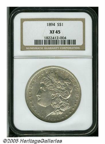 <B>1894<S$1> XF45 NGC.</B></I> A lightly toned and attractive example of this coveted low mintage Philadelphia Mint issue. Noticeable luster persists in protected areas, and unpleasant contact marks are not to be found.
