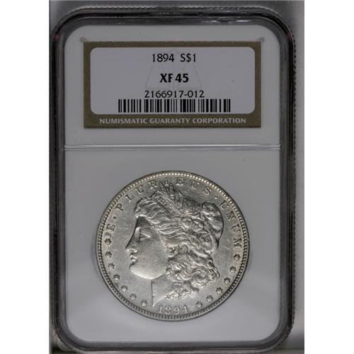<B>1894<img border='0' src='http://www.heritagecoins.com/images/star.gif' width=10 height=10>$1> XF45 NGC.</B></I> A pleasing untoned example of this scarce Morgan dollar issue. Wispy hairlines are noted in the fields, and each side has a few scattered abrasions, none of which are individually noteworthy. The assigned grade level seems both conservative and appropriate.