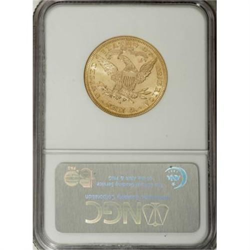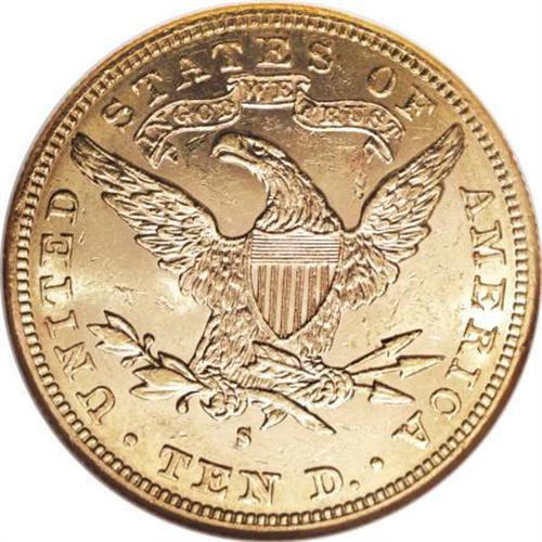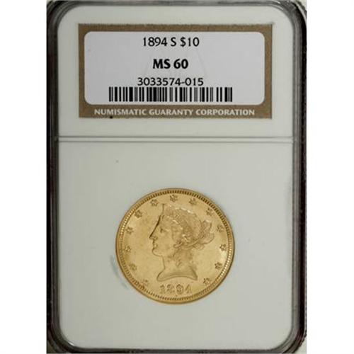 <B>1894-S $10 MS60 NGC.</B></I> 1890s San Francisco eagle mintages bottomed out in 1894, with a tiny production of 25,000 pieces. Double eagles were the preferred S-mint gold denomination that year, with a mintage of more than 1 million pieces. This precisely struck example is only lightly abraded for the grade, and has full luster on the reverse. The base of the 1 is repunched.<BR><BR><B>Coin Engraver:</B> Christian Gobrecht<BR><BR><b>Shipping:</b> Coins & Currency (<a target="_blank" href="http://www.heritageauctions.com/common/shipping.php">view shipping information</a>)