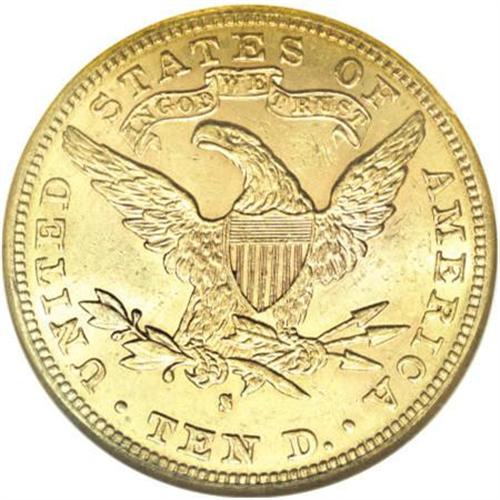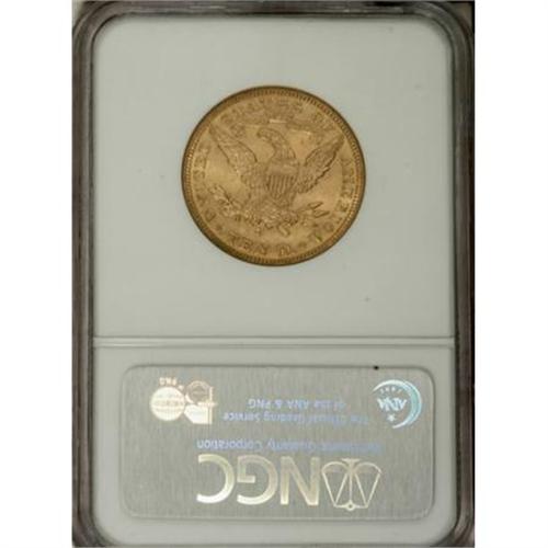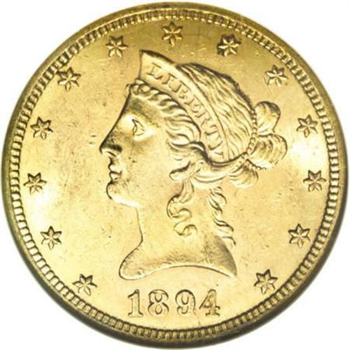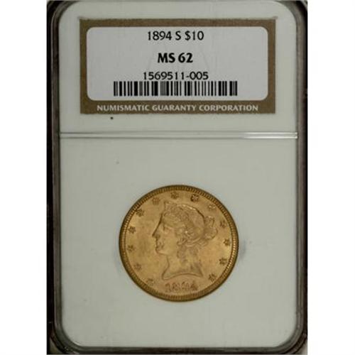 <B>1894-S $10 MS62 NGC.</B></I> At the time the Garrett-Guth <I>Encyclopedia of U.S. Gold Coins </B></I>was published (2006), there were two PCGS-graded MS62 pieces of this issue, and none at NGC. The latter service has since certified this piece as the single finest and only MS62 (1/08). The gold authors call the issue "rare in any Mint State grade" and add that "auction records are relatively meaningless, as neither of the [PCGS] MS-62 coins have appeared on the market."<BR> This, then, appears to be the sole MS62 survivor currently available. The orange-gold surfaces offer beaming luster, with numerous tiny, undistracting and grade-consistent ticks that constitute the grade. The strike is bold, and the eye appeal is quite high on this elusive and underrated issue.<BR><BR><B>Coin Engraver:</B> Christian Gobrecht<BR><BR><b>Shipping:</b> Coins & Currency (<a target="_blank" href="http://www.heritageauctions.com/common/shipping.php">view shipping information</a>)