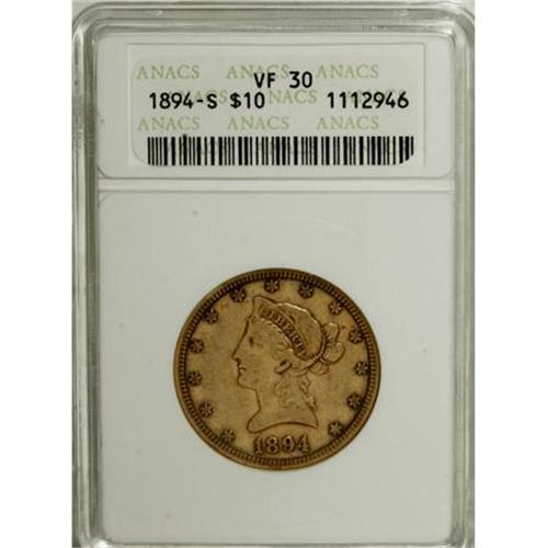 <B>1894-S $10 VF30 ANACS.</B></I> NGC Census: (0/130). PCGS Population (0/128). Mintage: 25,000. Numismedia Wsl. Price for NGC/PCGS coin in VF30: $379. (#8731)<BR><BR><B>Coin Engraver:</B> Christian Gobrecht<BR><BR><b>Shipping:</b> Coins & Currency (<a target="_blank" href="http://www.heritageauctions.com/common/shipping.php">view shipping information</a>)