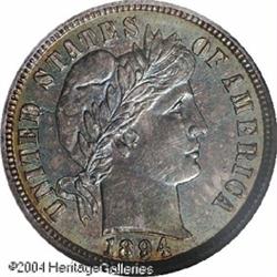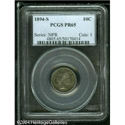 1894-S 10C PR65 PCGS. As one of the "Big Three" of Ame <B>1894-S 10C PR65 PCGS.</B></I> As one of the "Big Three" of American numismatics, along with the 1913 Liberty nickel and the 1804 silver dollar, acquisition of this rarity has long been regarded as a pinnacle of collecting. <B>Of these three rarities, only the 1894-S dime was officially listed in Mint Reports at the time of issue.</B></I><BR> This is one of the finest known 1894-S Barber dimes, and is the single most important example from a historical perspective. Only three of the nine currently known examples have been described as Gem quality. The Eliasberg Collection coin was described in the May 1996 sale as Proof 65; however, that coin has reportedly been dipped at least twice since the sale. The Eliasberg duplicate, sold by Stack's in 1947, is graded PR66 by NGC, but despite the grade, it is the coin that Eliasberg considered his duplicate, thus is probably no finer than the coin he kept.<BR> <B>In our opinion, this coin is equal to the primary Eliasberg coin retained for his collection, and these two are the two finest examples. Both of these coins are superior to the Eliasberg duplicate that was sold by Stack's in 1947, despite its higher certified grade.</B></I><BR> Why were there only 24 dimes struck at the San Francisco Mint in 1894? This question has been asked by numismatists for many years. And why were they all struck as Proofs? Several theories over the years have tried to explain the mintage of these coins.<BR> One of the early theories suggested that these 24 coins were simply struck to balance the books in 1894, as reported in the April 1928 issue of <I>The Numismatist.</B></I> This theory was related by Farran Zerbe who claims that the information was given to him at the San Francisco Mint in 1905:<BR> "To close a bullion account at the San Francisco Mint at the end of the fiscal year, June 30th, 1894, it was found necessary to show 40 cents, odd, in the year's coinage. The mint not having coined any dimes during the year, the dime dies were put to work, and to produce the needed 40 cents, 24 pieces were struck, any reasonable amount of even dollars over the 40 cents being readily absorbed in the account. It has been stated that at the time no thought was given by the mint people that a rarity had been produced, it being supposed they would, as always in the past, be ordered to coin dimes before the close of the year. It so happened that no dime coinage was ordered and the unintentional error was not realized until the year's coinage record was closed."<BR> Two parts of this theory do not seem to make sense today. If the coinage was indeed produced to close a bullion account that was off by 40 cents, why did it not matter how many even dollars over this amount were produced? Doesn't it make sense that the bullion account was then out of balance by two dollars? The second question surrounding the Zerbe report concerns the condition of these coins. With the exception of two heavily circulated examples, every known 1894-S dime is a Proof. If Mint personnel were simply balancing the account, why did they take the time to create these coins as Proofs, especially if "no thought was given by the mint people that a rarity had been produced." Today, the Zerbe account is considered to be illogical and inaccurate.<BR> James Johnson presented the Presentation Specimen theory in his <I>Coin World</B></I> article of September 13, 1972. He reported that his information came from Earl Parker who purchased two examples from Hallie Daggett in 1950. Hallie was the daughter of John Daggett, the superintendent of the San Francisco Mint in 1894. These details reportedly came directly from Hallie Daggett via Parker. It seems that seven banker friends of John Daggett were visiting the San Francisco Mint in 1894, and desirous of a souvenir, each received three freshly minted Proof dimes. The remaining three went to Daggett, who gave all three to his daughter. Why were dimes the coins of choice for this presentation? Why not special presentation gold coins or silver dollars? Also, why did Daggett give all three dimes to his middle child and not one to each of his three children? Perhaps he distributed them among all three and Hallie eventually received the others from her siblings. If she did spend one on ice cream, as the story is told, perhaps that was her only example, leaving just two coins in the family. The Johnson report provides the most credible theory about these coins, although even this is based on the memory of Earl Parker, two decades after the fact, with Parker relying on the recollection of Ms. Daggett, who was 72 years old when she met with Parker. Today, this is the production theory that is taken as fact, and is the theory that Walter Breen published in his various encyclopedic works.<BR> William Burd has discounted the Johnson theory as part fact and part fiction, stating that the part about various bankers each receiving three pieces is fictional. His research was published in "The Inscrutable 1894-S Dime" appearing in <I>The Numismatist,</B></I> February 1994. Burd suggested the possibility that "Daggett simply held a reception or party and produced the dimes as demonstration pieces or souvenirs. He may have had dignitaries in from Washington, local supporters, or relatives visiting from the East. Perhaps he held a gathering commemorating his nomination to the office a year earlier. At the time, he most likely believed a regular production of dimes would be run in the second half of the year." Today, this commentary provides even more speculation without any hard evidence. Burd continued: "Until someone can produce Mint records that detail day-to-day operations at San Francisco, we can only surmise what took place."<BR> Until such evidence is located, we will not know the true story behind these coins. Only a few facts are known, everything else is speculation:<BR> 1. Only 24 examples were struck and they were str