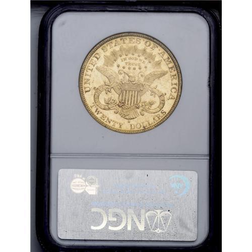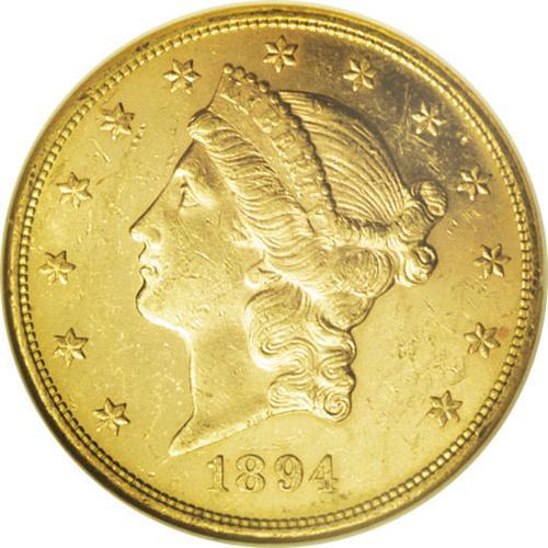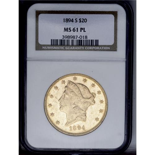 <B>1894-S<$20> MS61 Prooflike NGC.</B></I> Boldly struck with excellent reflectivity from the yellow-gold fields. The devices are lightly frosted, more notably on the obverse. Myriad abrasions across both sides account for the grade.<BR><I>From The New York Eye Appeal Collection.</B></I>