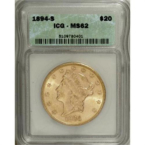<B>1894-S $20 MS62 ICG.</B></I> NGC Census: (1403/542). PCGS Population (1104/684). Mintage: 1,048,550. Numismedia Wsl. Price for NGC/PCGS coin in MS62: $745. (#9026)<BR><BR><b>Shipping:</b> Coins & Currency (<a target="_blank" href="http://www.heritageauctions.com/common/shipping.php">view shipping information</a>)