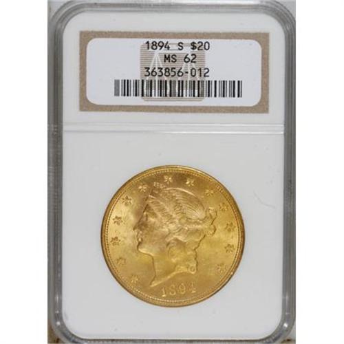 <B>1894-S $20 MS62 NGC.</B></I> NGC Census: (1403/544). PCGS Population (1104/684). Mintage: 1,048,550. Numismedia Wsl. Price for NGC/PCGS coin in MS62: $745. (#9026)<BR><BR><b>Shipping:</b> Coins & Currency (<a target="_blank" href="http://www.heritageauctions.com/common/shipping.php">view shipping information</a>)