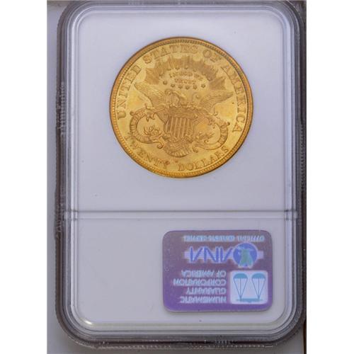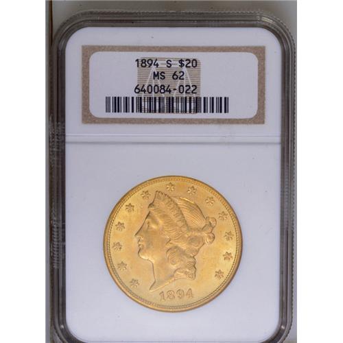 <B>1894-S<$20> MS62 NGC.</B></I> Sharply struck design elements complement attractive greenish-gold patination that overlies radiant luster. A scattering of light abrasions keeps this generally appealing specimen from a higher grade.