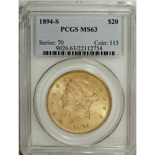 1894-S $20 MS63 PCGS. Suitably impressed with a filled