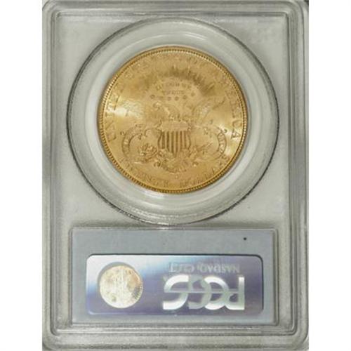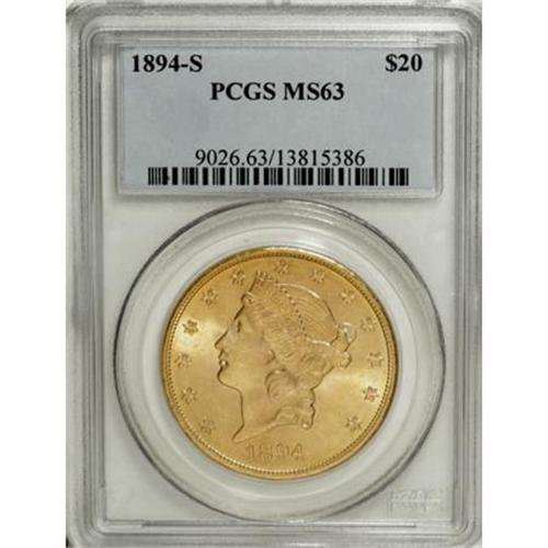 <B>1894-S $20 MS63 PCGS.</B></I> Even after most of the easily reachable gold in California was mined, the San Francisco Mint continued to churn out double eagles, and in 1894, it produced a seven-figure mintage. This Select piece offers flashy luster and bold central detail. The minimally abraded surfaces are largely yellow-gold with splashes of orange.<BR><BR><B>Coin Engraver:</B> James B. Longacre<BR><BR><b>Shipping:</b> Coins & Currency (<a target="_blank" href="http://www.heritageauctions.com/common/shipping.php">view shipping information</a>\)