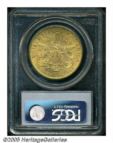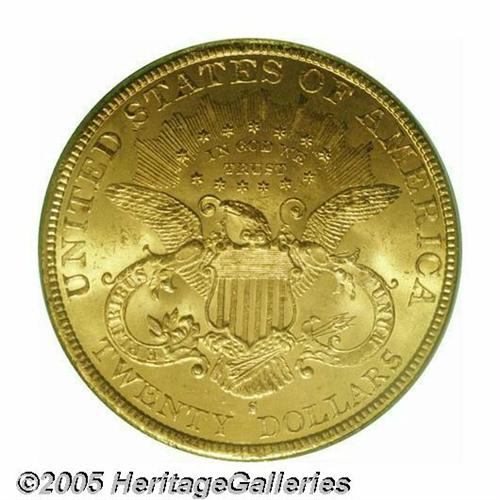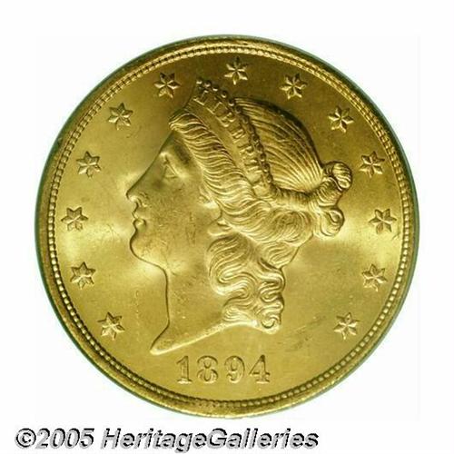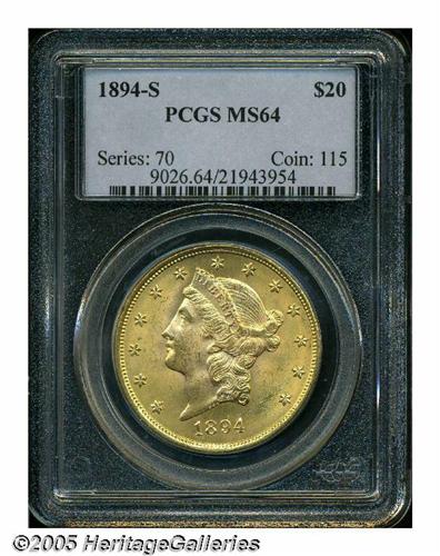 <B>1894-S<$20> MS64 PCGS.</B></I> Brilliant and satiny, with most design details showing bold definition including Liberty's hair and the obverse stars, all of which show their radials. A small planchet flaw is noted at the rim beneath the date which prevented the rim from being fully struck up in that area. Not an easy issue to find at the MS64 grade level, and almost impossible to find finer. Population: 94 in 64, 1 finer (4/05).