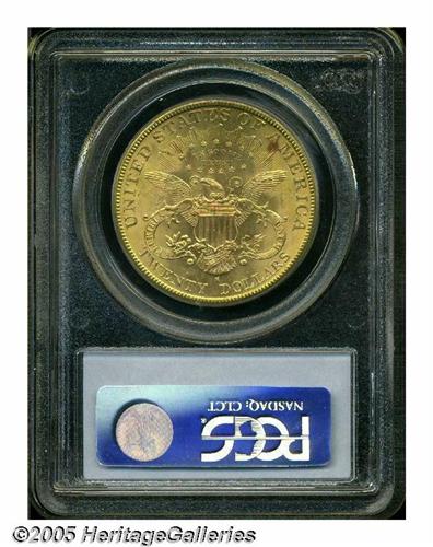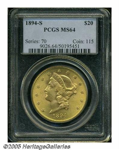 <B>1894-S<$20> MS64 PCGS.</B></I> The fields have a golden-green hue, while the centers have peach patina. A lustrous piece that is only modestly abraded for the assigned grade. A copper toning spot is seen over the first A of AMERICA.