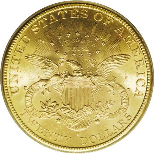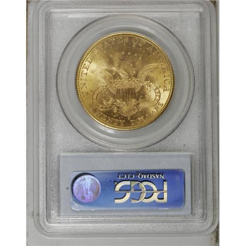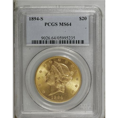 <B>1894-S $20 MS64 PCGS.</B></I> This impressive near-Gem gives the initial impression of an even finer grade, since close inspection is required to locate any grade-limiting marks. Nicely struck and lustrous with excellent eye appeal. As of (10/06), PCGS has certified only a single example finer, as an MS65.<BR><BR><b>Shipping:</b> Coin/Currency (<a target="_blank" href="http://www.heritageauctions.com/common/shipping.php">view shipping information</a>)