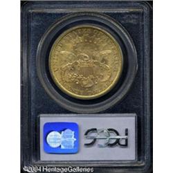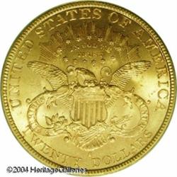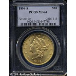 1894-S $20 MS64 PCGS. This is one of 26 different <B>1894-S $20 MS64 PCGS.</B></I> This is one of 26 different Type Three double eagle issues with mintages in excess of one million coins; however, is a rarity in Choice or Gem quality. Nearly all of the 1,048,550 coins produced entered circulation, or were exported with many of those later melted. Those coins that have returned to this country are apt to be low-end mint state at best. Sharply struck with brilliant yellow-gold luster and splendid surfaces, highlighted by pinkish toning. The obverse is especially undisturbed. This is one of the finest 1894-S twenties on the market. PCGS has graded just one finer coin, an MS65 example. Population: 86 in 64, 1 finer (10/04). <BR><BR><B>Important notice:</B> Heritage usually auctions material at the rate of 200-250 lots per hour. On some occasions eBay Live bid software or the Internet may not be able to keep up with the pace of the auction. We recommend placing a realistic absentee bid now as insurance to avoid disappointment. Occasionally the auctioneer may eliminate or reject an eBay Live bid, and the auctioneer may also reopen a lot after the close of the eBay live bidding (usually because we missed an audience bid), and may reject your bid even if it shows you as the winning bidder. By bidding via eBay Live, you agree that Heritage may award the lot to another bidder at its sole discretion under the circumstances described above or any other reasonable circumstances. Since eBay bids are not shown to us until we open the lot on the floor, we treat those bids just like floor bids. In most cases the floor responds before the eBay bid is presented to us, due to Internet lag time, so for consistency we have made it a policy that floor bids are always considered first over tie eBay live bids. Also please note that all Heritage lots purchased through eBay Live carry a 20% Buyer's Premium. Please make sure you read the Terms and Conditions before you bid. This lot is being auctioned in conjunction with a live floor auction by Heritage Galleries & Auctioneers. All final auction and invoice information will be supplied by Heritage Galleries & Auctioneers, and all other information should be considered preliminary. Lot:6962