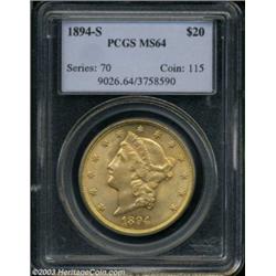<table><tr><td><TABLE cellSpacing=0 cellPadding=0 width="100%" bgColor=#000000 border=0><TBODY> <TR><TD width="100%"><TABLE cellSpacing=1 cellPadding=3 width="100%" border=0><TBODY><TR><TD width="100%" bgColor=#79735c><FONT face=arial color=#ffffff size=3><B>Description</B> </FONT></TD></TR><TR><TD width="100%" bgColor=#ffffff><FONT face=arial size=2><B>1894-S $20 MS64 PCGS.</B></I> Booming luster and a refreshingly unabraded obverse combine with an exquisite strike and lovely peach color for pleasing eye appeal. DOLLARS is lightly strike doubled. Although more than 1 million 1894-S Double Eagles were minted, these were strictly regarded as bullion coins for many generations, and very few have survived with Choice surfaces. Population: 74 in 64, 1 finer (10/03). </FONT></TD></TR></TBODY></TABLE></TD></TR></TBODY></TABLE><BR><A name=PricesRealized></A><TABLE cellSpacing=0 cellPadding=0 width="100%" bgColor=#000000 border=0><TBODY><TR><TD width="100%"><TABLE cellSpacing=1 cellPadding=3 width="100%" border=0><TBODY><TR><TD width="100%" bgColor=#79735c><A name=PR><FONT face=arial color=#ffffff size=3><B>Previous Prices from Heritage Auctions</B> </FONT></A></TD></TR><TR><TD bgColor=#f6f6ed><TABLE cellSpacing=0 cellPadding=0 width="100%" border=1><TBODY><TR><TD align=middle width="33%"><B>Date</B></TD><TD align=middle width="33%"><B>Service</B></TD><TD align=middle width="33%"><B>Price</B></TD></TR><TR bgColor=whitesmoke><TD width="33%"><B>09/10/2002</B></TD><TD width="33%">PCGS</TD><TD width="33%">$4,370.00</TD></TR><TR bgColor=whitesmoke><TD width="33%"><B>01/11/2003</B></TD><TD width="33%">PCGS</TD><TD width="33%">$4,485.00</TD></TR><TR bgColor=whitesmoke><TD width="33%"><B>08/08/2001</B></TD><TD width="33%">PCGS</TD><TD width="33%">$3,737.50</TD></TR><TR bgColor=whitesmoke><TD width="33%"><B>11/18/1999</B></TD><TD width="33%">PCGS</TD><TD width="33%">$5,520.00</TD></TR><TR bgColor=whitesmoke><TD width="33%"><B>01/10/1998</B></TD><TD width="33%">NGC</TD><TD width="33%">$6,555.00</TD></TR><TR bgColor=whitesmoke><TD width="33%"><B>01/01/2000</B></TD><TD width="33%">NGC</TD><TD width="33%">$5,290.00</TD></TR></TBODY></TABLE></TD></TR><TR><TD bgColor=#ffffff><FONT face=arial size=1 ?>PLEASE NOTE: All prices realized reflect the final hammer price PLUS the buyer's premium in auctions that charge a buyer's premium. Each item has a notation at the top of the listing indicating whether that lot included a buyer's premium. Example: A item that sells with a final hammer price of $100 and a 20% buyer's premium will display with a price realized of $120. All information listed is intended to be as accurate as possible, but errors are possible. Please use this guide carefully and inform us of any inaccuracies. </FONT></TD></TR></TBODY></TABLE></TD></TR></TBODY></TABLE><BR><TABLE cellSpacing=0 cellPadding=0 width="100%" bgColor=#000000 border=0><TBODY><TR><TD width="100%"><TABLE cellSpacing=1 cellPadding=3 width="100%" border=0><TBODY><TR><TD width="100%" bgColor=#79735c colSpan=6><FONT face=arial color=#ffffff size=3><B>Price Guide*</B> </FONT></TD></TR><TR bgColor=#f6f6ed><TD align=middle><B>Grade</B> </TD><TD align=middle><B>Coin World<BR>(Trends)</B> </TD><TD align=middle><B>Numismedia<BR>Retail</B> </TD><TD align=middle><B>Numismedia<BR>Wholesale</B> </TD><TD align=middle><B>Coin<BR>Universe</B> </TD><TD align=middle><B>Heritage<BR>Value Index</B> </TD></TR><TR bgColor=#ffffff><TD align=middle>63</TD><TD align=right>$1,750.00</TD><TD align=right>---</TD><TD align=right>$1,250.00</TD><TD align=right>$2,150.00</TD><TD align=right>$1,502.50</TD></TR><TR style="FONT-WEIGHT: bold" bgColor=#cccfdd><TD align=middle>64</TD><TD align=right>$9,250.00</TD><TD align=right>---</TD><TD align=right>$4,325.00</TD><TD align=right>$6,500.00</TD><TD align=right>$5,058.75</TD></TR><TR bgColor=#ffffff><TD align=middle>65</TD><TD align=right>---</TD><TD align=right>---</TD><TD align=right>$16,500.00</TD><TD align=right>---</TD><TD align=right>$10,740.00</TD></TR><TR bgColor=#ffffff><TD colSpan=6><FONT size=1>*All information listed is intended to be as accurate as possible, but errors are possible. No item may be returned or refused based on this information which is provided as a service to our customers. You should contact each pricing source directly to determine the accuracy of this information. </FONT></TD></TR></TBODY></TABLE></TD></TR></TBODY></TABLE><BR><TABLE cellSpacing=0 cellPadding=0 width="100%" bgColor=#000000 border=0><TBODY><TR><TD width="100%"><TABLE cellSpacing=1 cellPadding=3 width="100%" border=0><TBODY><TR><TD width="100%" bgColor=#79735c><FONT face=arial color=#ffffff size=3><B>Population Guide</B> </FONT></TD></TR><TR bgColor=#ffffff><TD align=middle><!-- Begin Output of Population Grid--><TABLE cellSpacing=0 cellPadding=0 width="100%" border=0><TBODY><TR><TD vAlign=center><TABLE cellSpacing=0 width="100%" border=1 cellsadding="3"><TBODY><TR><TD vAlign=center><TABLE cellSpacing=0 cellPadding=3 width="100%" border=1><TBODY><TR><TD vAlign=center align=middle bgColor=#f0f1e8 colSpan=2 <CENTER><FONT face=Arial size=2><B>PCGS Pop </B></FONT><CENTER></CENTER></TD><TD vAlign=center align=middle bgColor=#f0f1e8 colSpan=2><CENTER><FONT face=Arial size=2><B>NGC Pop</B></CENTER></FONT></TD></TR><TR><TD vAlign=center><FONT face=Arial size=2>(64)</FONT> </TD><TD vAlign=center align=right><FONT face=Arial size=2>74</FONT> </TD><TD vAlign=center><FONT face=Arial size=2>(64)</FONT> </TD><TD vAlign=center align=right><FONT face=Arial size=2>57</FONT> </TD></TR><TR><TD vAlign=center><FONT face=Arial size=2>(>64)</FONT> </TD><TD vAlign=center align=right><FONT face=Arial size=2>1</FONT> </TD><TD vAlign=center><FONT face=Arial size=2>(>64)</FONT> </TD><TD vAlign=center align=right><FONT face=Arial size=2>7</FONT> </TD></TR></TBODY></TABLE></TD></TR></TBODY></TABLE></TD></TR></TBODY></TABLE><!-- End Output of Population Grid--></TD></TR></TBODY></TABLE></TD></TR></TBODY></TABLE><BR><TABLE cellSpacing=0 cellPadding=0 w