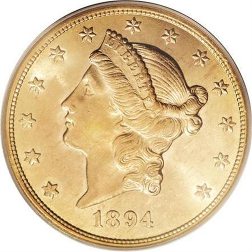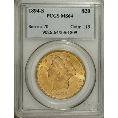 <B>1894-S $20 MS64 PCGS.</B></I> This charming canary-gold Choice Liberty twenty has pleasantly unperturbed surfaces, and the strike is crisp apart from minor merging within the hair curls. Thousands of 1894-S double eagles eventually emerged from bank accumulations, but most are heavy bagmarked, unlike the present piece. PCGS has certified only one finer (11/07).<BR><I>From The Parker Lee III Collection.</B></I><BR><BR><B>Coin Engraver:</B> James B. Longacre<BR><BR><b>Shipping:</b> Coins & Currency (<a target="_blank" href="http://www.heritageauctions.com/common/shipping.php">view shipping information</a>)