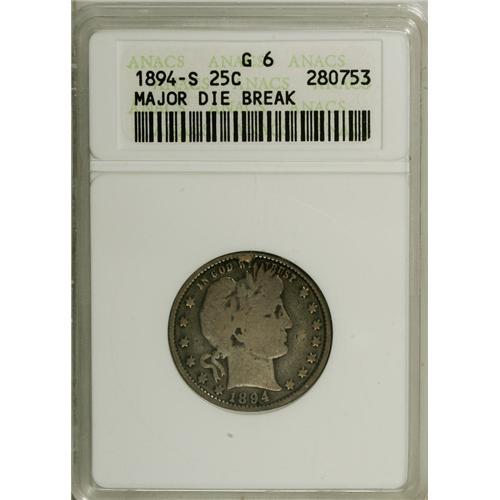 <B>1894-S 25C Quarter--Major Die Break--G6 ANACS.</B></I> NGC Census: (0/153). PCGS Population (0/157). Mintage: 2,648,821. Numismedia Wsl. Price for NGC/PCGS coin in G6 : $8. (#5609)<BR><BR><b>Shipping:</b> Coins & Currency (<a target="_blank" href="http://www.heritageauctions.com/common/shipping.php">view shipping information</a>)