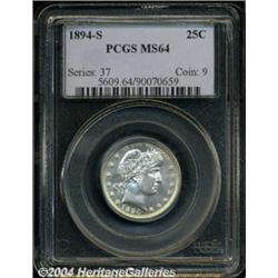 <B>1894-S<25C> MS64 PCGS.</B></I> Bright and completely untoned with a bold strike. The S mintmark is punched far to the right over the D of DOLLAR as there was insufficient space to place it directly under the eagle's tail. A minimally marked, sharply defined specimen, and certainly a candidate for an even finer grade. Population: 35 in 64, 11 finer (3/04).<BR><I>Ex: Long Beach Signature Sale (Heritage, 9/03), lot 6698, which realized $1,495.</B></I><BR><I>From the JFS Collection.</B></I> <BR><BR><B>Important notice:</B> Heritage usually auctions material at the rate of 200-250 lots per hour. On some occasions eBay Live bid software or the Internet may not be able to keep up with the pace of the auction. We recommend placing a realistic absentee bid now as insurance to avoid disappointment. Occasionally the auctioneer may eliminate or reject an eBay Live bid, and the auctioneer may also reopen a lot after the close of the eBay live bidding (usually because we missed an audience bid), and may reject your bid even if it shows you as the winning bidder. By bidding via eBay Live, you agree that Heritage may award the lot to another bidder at its sole discretion under the circumstances described above or any other reasonable circumstances. Since eBay bids are not shown to us until we open the lot on the floor, we treat those bids just like floor bids. In most cases the floor responds before the eBay bid is presented to us, due to Internet lag time, so for consistency we have made it a policy that floor bids are always considered first over tie eBay live bids. Also please note that all Heritage lots purchased through eBay Live carry a 20% Buyer's Premium. Please make sure you read the Terms and Conditions before you bid. </span></font></tr></table></td></tr></table>