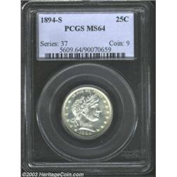 <TABLE cellSpacing=0 cellPadding=0 width="100%" bgColor=#000000 border=0><TBODY><TR><TD width="100%"><TABLE cellSpacing=1 cellPadding=3 width="100%" border=0><TBODY><TR><TD width="100%" bgColor=#79735c><FONT face=arial color=#ffffff size=3><B>Description</B> </FONT></TD></TR><TR><TD width="100%" bgColor=#ffffff><FONT face=arial size=2><B>1894-S 25C MS64 PCGS.</B></I> Bright and untoned with a bold strike. The S mintmark is punched far to the right over the D of DOLLAR. A couple of tiny contact marks are seen on Liberty's cheek and nose. </FONT></TD></TR></TBODY></TABLE></TD></TR></TBODY></TABLE><BR><A name=PricesRealized></A><TABLE cellSpacing=0 cellPadding=0 width="100%" bgColor=#000000 border=0><TBODY><TR><TD width="100%"><TABLE cellSpacing=1 cellPadding=3 width="100%" border=0><TBODY><TR><TD width="100%" bgColor=#79735c><A name=PR><FONT face=arial color=#ffffff size=3><B>Previous Prices from Heritage Auctions</B> </FONT></A></TD></TR><TR><TD bgColor=#f6f6ed><TABLE cellSpacing=0 cellPadding=0 width="100%" border=1><TBODY><TR><TD align=middle width="33%"><B>Date</B></TD><TD align=middle width="33%"><B>Service</B></TD><TD align=middle width="33%"><B>Price</B></TD></TR><TR bgColor=whitesmoke><TD width="33%"><B>01/06/1996</B></TD><TD width="33%">PCGS</TD><TD width="33%">$1,430.00</TD></TR><TR bgColor=whitesmoke><TD width="33%"><B>03/01/2001</B></TD><TD width="33%">NGC</TD><TD width="33%">$920.00</TD></TR><TR bgColor=whitesmoke><TD width="33%"><B>01/05/2001</B></TD><TD width="33%">NGC</TD><TD width="33%">$891.25</TD></TR><TR bgColor=whitesmoke><TD width="33%"><B>09/18/1996</B></TD><TD width="33%">NGC</TD><TD width="33%">$770.00</TD></TR><TR bgColor=whitesmoke><TD width="33%"><B>01/11/2003</B></TD><TD width="33%">PCGS</TD><TD width="33%">$1,150.00</TD></TR><TR bgColor=whitesmoke><TD width="33%"><B>11/15/2001</B></TD><TD width="33%">PCGS</TD><TD width="33%">$805.00</TD></TR><TR bgColor=whitesmoke><TD width="33%"><B>03/23/2003</B></TD><TD width="33%">NGC</TD><TD width="33%">$776.25</TD></TR></TBODY></TABLE></TD></TR><TR><TD bgColor=#ffffff><FONT face=arial size=1 ?>PLEASE NOTE: All prices realized reflect the final hammer price PLUS the buyer's premium in auctions that charge a buyer's premium. Each item has a notation at the top of the listing indicating whether that lot included a buyer's premium. Example: A item that sells with a final hammer price of $100 and a 20% buyer's premium will display with a price realized of $120. All information listed is intended to be as accurate as possible, but errors are possible. Please use this guide carefully and inform us of any inaccuracies. </FONT></TD></TR></TBODY></TABLE></TD></TR></TBODY></TABLE><BR><TABLE cellSpacing=0 cellPadding=0 width="100%" bgColor=#000000 border=0><TBODY><TR><TD width="100%"><TABLE cellSpacing=1 cellPadding=3 width="100%" border=0><TBODY><TR><TD width="100%" bgColor=#79735c colSpan=6><FONT face=arial color=#ffffff size=3><B>Price Guide*</B> </FONT></TD></TR><TR bgColor=#f6f6ed><TD align=middle><B>Grade</B> </TD><TD align=middle><B>Coin World<BR>(Trends)</B> </TD><TD align=middle><B>Numismedia<BR>Retail</B> </TD><TD align=middle><B>Numismedia<BR>Wholesale</B> </TD><TD align=middle><B>Coin<BR>Universe</B> </TD><TD align=middle><B>Heritage<BR>Value Index</B> </TD></TR><TR bgColor=#ffffff><TD align=middle>63</TD><TD align=right>$750.00</TD><TD align=right>$780.00</TD><TD align=right>$625.00</TD><TD align=right>$750.00</TD><TD align=right>$490.63</TD></TR><TR style="FONT-WEIGHT: bold" bgColor=#cccfdd><TD align=middle>64</TD><TD align=right>$1,400.00</TD><TD align=right>---</TD><TD align=right>$1,225.00</TD><TD align=right>$1,575.00</TD><TD align=right>$994.38</TD></TR><TR bgColor=#ffffff><TD align=middle>65</TD><TD align=right>$3,000.00</TD><TD align=right>---</TD><TD align=right>$2,375.00</TD><TD align=right>$3,600.00</TD><TD align=right>$2,672.50</TD></TR><TR bgColor=#ffffff><TD colSpan=6><FONT size=1>*All information listed is intended to be as accurate as possible, but errors are possible. No item may be returned or refused based on this information which is provided as a service to our customers. You should contact each pricing source directly to determine the accuracy of this information. </FONT></TD></TR></TBODY></TABLE></TD></TR></TBODY></TABLE><BR><TABLE cellSpacing=0 cellPadding=0 width="100%" bgColor=#000000 border=0><TBODY><TR><TD width="100%"><TABLE cellSpacing=1 cellPadding=3 width="100%" border=0><TBODY><TR><TD width="100%" bgColor=#79735c><FONT face=arial color=#ffffff size=3><B>Population Guide</B> </FONT></TD></TR><TR bgColor=#ffffff><TD align=middle><!-- Begin Output of Population Grid--><TABLE cellSpacing=0 cellPadding=0 width="100%" border=0><TBODY><TR><TD vAlign=center><TABLE cellSpacing=0 width="100%" border=1 cellsadding="3"><TBODY><TR><TD vAlign=center><TABLE cellSpacing=0 cellPadding=3 width="100%" border=1><TBODY><TR><TD vAlign=center align=middle bgColor=#f0f1e8 colSpan=2 <CENTER><FONT face=Arial size=2><B>PCGS Pop </B></FONT><CENTER></CENTER></TD><TD vAlign=center align=middle bgColor=#f0f1e8 colSpan=2><CENTER><FONT face=Arial size=2><B>NGC Pop</B></CENTER></FONT></TD></TR><TR><TD vAlign=center><FONT face=Arial size=2>(64)</FONT> </TD><TD vAlign=center align=right><FONT face=Arial size=2>28</FONT> </TD><TD vAlign=center><FONT face=Arial size=2>(64)</FONT> </TD><TD vAlign=center align=right><FONT face=Arial size=2>46</FONT> </TD></TR><TR><TD vAlign=center><FONT face=Arial size=2>(>64)</FONT> </TD><TD vAlign=center align=right><FONT face=Arial size=2>9</FONT> </TD><TD vAlign=center><FONT face=Arial size=2>(>64)</FONT> </TD><TD vAlign=center align=right><FONT face=Arial size=2>13</FONT> </TD></TR></TBODY></TABLE></TD></TR></TBODY></TABLE></TD></TR></TBODY></TABLE><!-- End Output of Population Grid--> Important notice: Heritage usually auctions material at the rate of 200-250 lots per hour. On some occasions eBay Live bid software or the Internet may not be able to keep up with the pace of the auction. We