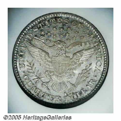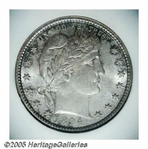 <B>1894-S<25C> MS65 NGC.</B></I> A gently toned coin, with pleasant medium silver-gray color with hints of purple as the coin is turned under a light. This covering does not block the original glow from the surfaces. The strike is strong, the mintmark oddly punched over the D in DOLLAR and very near the arrows. Population: 13 in 65, 5 finer (6/05).