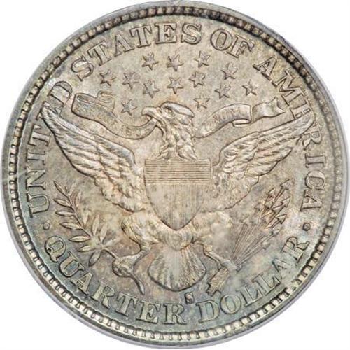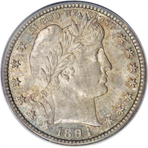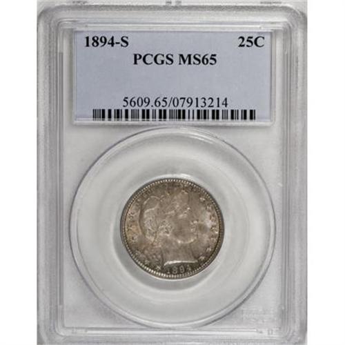 <B>1894-S 25C MS65 PCGS.</B></I> This S-mint issue is rather elusive as a Gem, despite a respectable mintage of 2,648,821 pieces. Sharply struck and lustrous, with variegated sea-green, golden-tan and amber-gray toning over both sides. The well preserved surfaces are essentially blemish-free. Population: 28 in 65, 3 finer (9/07).<BR><BR><B>Coin Engraver:</B> Charles E. Barber<BR><BR><b>Shipping:</b> Coins & Currency (<a target="_blank" href="http://www.heritageauctions.com/common/shipping.php">view shipping information</a>)