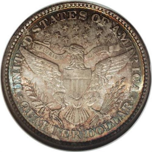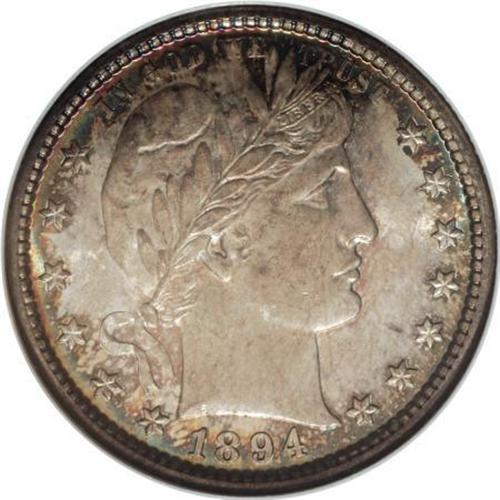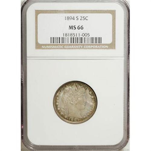 <B>1894-S 25C MS66 NGC.</B></I> An essentially full strike with exquisite toning that comes in a colorful array of colors. Each side features reddish-orange, blue-green, dove-gray, and turquoise shades that deepen slightly at the borders. One has to examine its surfaces carefully and with magnification to find any contact marks. Census: 5 in 66, 0 finer (7/07).<BR><BR><B>Coin Engraver:</B> Charles E. Barber<BR><BR><b>Shipping:</b> Coins & Currency (<a target="_blank" href="http://www.heritageauctions.com/common/shipping.php">view shipping information</a>\)
