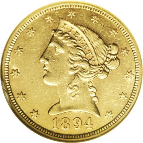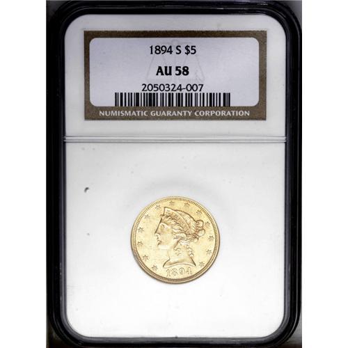 <B>1894-S<$5> AU58 NGC.</B></I> Light in color with few appreciable surface marks and just the slightest break in luster from Mint State. The number of better grade survivors of this difficult S-mint is extremely limited, enough so that noted gold specialist singled this issue out as the most underrated in the Coronet half eagle series. Census: 35 in 58, 14 finer (3/06). <BR><BR><B>Important notice:</B> Heritage usually auctions material at the rate of 200-250 lots per hour. On some occasions eBay Live bid software or the Internet may not be able to keep up with the pace of the auction. We recommend placing a realistic absentee bid now as insurance to avoid disappointment. Occasionally the auctioneer may eliminate or reject an eBay Live bid, and the auctioneer may also reopen a lot after the close of the eBay live bidding (usually because we missed an audience bid), and may reject your bid even if it shows you as the winning bidder. By bidding via eBay Live, you agree that Heritage may award the lot to another bidder at its sole discretion under the circumstances described above or any other reasonable circumstances. Since eBay bids are not shown to us until we open the lot on the floor, we treat those bids just like floor bids. In most cases the floor responds before the eBay bid is presented to us, due to Internet lag time, so for consistency we have made it a policy that floor bids are always considered first over tie eBay live bids. Also please note that all Heritage lots purchased through eBay Live carry a 20% Buyer's Premium. Please make sure you read the Terms and Conditions before you bid. This lot is being auctioned in conjunction with a live floor auction by Heritage Galleries & Auctioneers. All final auction and invoice information will be supplied by Heritage Galleries & Auctioneers, and all other information should be considered preliminary. Lot:2836 <BR><BR><B>Winning Notification and Billing:</B> After the FINAL session in this auction is complete, Heritage will send e-mail and snail mail invoices. This process normally takes several days. All final auction and invoice information will be supplied by Heritage Galleries & Auctioneers, and all other information should be considered preliminary. <BR><BR>This auction will be conducted on a live auction floor and over the Internet through eBay Live. If you choose to place an absentee bid, please take a moment to <font color='#0000ff'><u><a href='http://pages.ebay.com/liveauctions/help/before/laabsentee.html'>learn how eBay Live absentee bidding works</a></u></font><font color='#000000'>