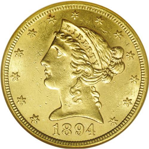 <B>1894-S<$5> MS60 NGC.</B></I> The mintmark is repunched. Well struck with full even luster and a pleasing, flashy sheen. Numerous small abrasions and a shallow scrape, in the left obverse field, define the grade. Only 55,900 pieces were struck, few if any of which were set aside at the time of issue. Census: 2 in 60, 12 finer (2/06).