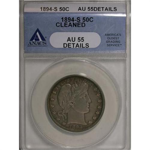 <B>1894-S 50C --Cleaned--ANACS. AU55 Details.</B></I> NGC Census: (6/111). PCGS Population (13/126). Mintage: 4,048,690. Numismedia Wsl. Price for NGC/PCGS coin in AU55: $325. (#6470)<BR><BR><B>Coin Engraver:</B> Charles E. Barber<BR><BR><b>Shipping:</b> Coins & Currency (<a target="_blank" href="http://www.heritageauctions.com/common/shipping.php">view shipping information</a>)