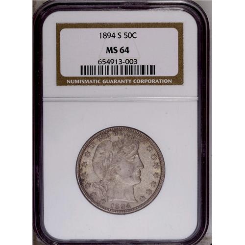<B>1894-S<50C> MS64 NGC.</B></I> Amber-gray toning gently covers lustrous underlying surfaces with ample mint bloom still visible through this covering. Well struck throughout, a few small abrasions are detected in the obverse field that serve to limit the grade. Although the highest mintage S-mint in the series, Choice and better examples are nevertheless scarce. Census: 35 in 64, 5 finer (2/06).