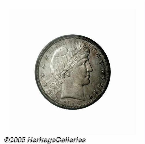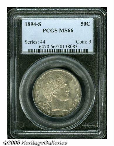 <B>1894-S<50C> MS66 PCGS.</B></I> With a mintage in excess of four million pieces, the 1894-S is one of the most available Barber halves, including higher grade, even Uncirculated coins. Of course, the landscape changes dramatically above the MS64 level. A couple of dozen pieces exist as near-Gems, but just a handful of MS65 and better coins are known. This is unquestionably one of the finest examples extant and it exhibits bright, semi-prooflike surfaces from having been struck from polished dies. The surfaces are untampered and original with light golden, lilac, and rose patina with the trace of a fingerprint on the lower obverse. Sharply defined throughout. Population: 4 in 66, 1 finer (6/05).