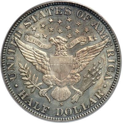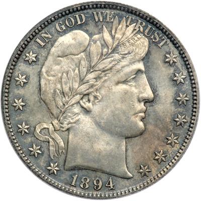 1894-S Barber Half Dollar. PCGS graded MS-64. Lightly toned. A mintage over four million pieces would seem to imply the 1894-S one of the most available Barber halves, including higher grade, even Uncirculated coins. This isn't what we find, and above the MS64 level, the coin becomes scarce indeed. This is one of the better-quality examples and it show signs of silvery surfaces under the toning from having been struck from defect-free. The surfaces are spot-free and original with natural patina. Sharply defined throughout. Pop 45; 29 finer (PCGS # 6470) .