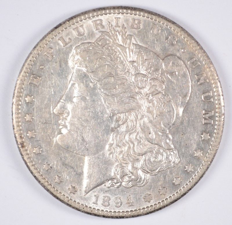 1894-S MORGAN SILVER DOLLAR, AU-55+ WHITE, VERY SCARCE IN THIS GRADE