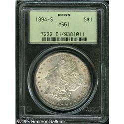 <B>1894-S<img border='0' src='http://www.heritagecoins.com/images/star.gif' width=10 height=10>$1 MS61 PCGS.</B></I> Well struck with frosty apricot-gray surfaces that are rather scuffy on the obverse. An affordable example of this more difficult S-mint issue. Lot:10447