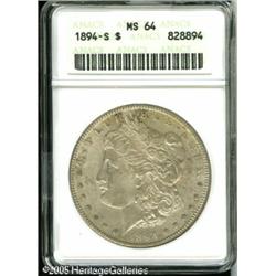 <B>1894-S<img border='0' src='http://www.heritagecoins.com/images/star.gif' width=10 height=10>$1 MS64 ANACS.</B></I> Lightly toned with nice luster. A few miniscule marks on Liberty's cheek limit the grade. Just 1,500 to 2,500 specimens are estimated to exist in MS64. Lot:10452
