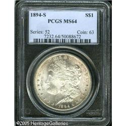 <B>1894-S<img border='0' src='http://www.heritagecoins.com/images/star.gif' width=10 height=10>$1 MS64 PCGS.</B></I> Hints of reddish-gold patina frequent the borders of this highly lustrous near-Gem. The strike is very good if not exceptional, while the nearly immaculate fields and clean cheek will impress even the most demanding specialist. A challenging issue despite a significant mintage, the 1894-S is infrequently encountered in better Mint State grades. Lot:10453