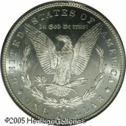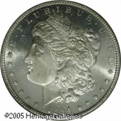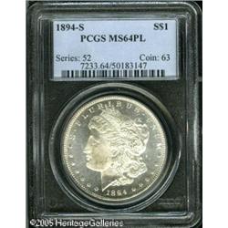 <B>1894-S<img border='0' src='http://www.heritagecoins.com/images/star.gif' width=10 height=10>$1 MS64 Prooflike PCGS.</B></I> While the '94-S is available with Prooflike fields, rarely is it found in high grades. Most examples are MS 60-62 and heavily abraded. Nicely defined and untoned, both sides are pleasingly reflective in the fields. Minimally abraded for a silver coin of this size. Population: 25 in 64, 2 finer (1/05). Lot:10455