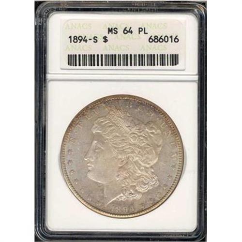 <b>1894-S Morgan Dollar. ANACS graded MS64 PL.</b> Very choice prooflike surfaces with a change to more subtle frost on the devices. The color swings from imperial silver-gray to light shades of brown. Substantial detail to the highpoints on this exceptional 1894-S example, with a thorough and effectual imprint from the dies in the key central region; there are no weak areas left after the recoil of the dies, none whatsoever <b>(PCGS # 7233)</b>