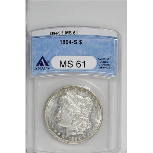 <B>1894-S<img border='0' src='http://www.heritagecoins.com/images/star.gif' width=10 height=10>$1> MS61 ANACS.</B></I> The hazy fields have somewhat reflective luster. A nicely struck piece with numerous small marks and abrasions that account for the grade.
