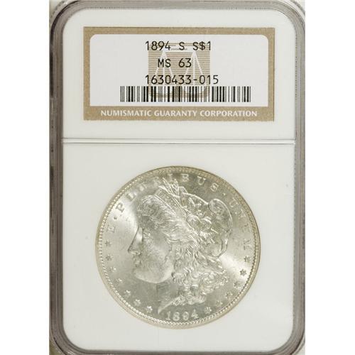 <B>1894-S S$1 MS63 NGC.</B></I> Hints of golden-tan color visit highly lustrous surfaces on this Select S-mint. A well executed strike imparts good detail on the design features. Minute obverse marks limit the grade.<BR><BR><b>Shipping:</b> Coins & Currency (<a target="_blank" href="http://www.heritageauctions.com/common/shipping.php">view shipping information</a>)