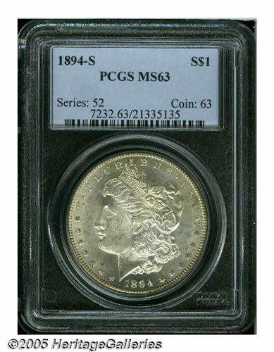 <B>1894-S<S$1> MS63 PCGS.</B></I> The 1894-S is the most readily available issue of the 1894-1895 years. This specimen is highly lustrous, and exhibits wisps of light tan patina here and there. The design elements are adequately struck, though the hair over Liberty's ear is weak. Some grade-defining minute contact marks and scuffs are located on Liberty's cheek and in the obverse fields.
