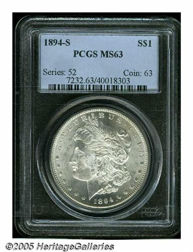 <B>1894-S<S$1> MS63 PCGS.</B></I> This is a sharply impressed coin for the issue. There are few notable abrasions, and the mostly silver-white surfaces reveal even few luster grazes. A conditionally scarce S-mint issue.