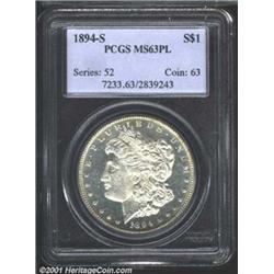 1894-S S$1 MS63 Prooflike PCGS. A solidly reflective coin, with frosted, boldly detailed devices attractively set against prooflike fields. Silvery in color as when it was first produced. Population: 25 in 63, 23 finer (11/01). Important notice: We expect to be auctioning lots at the rate of 200-250 per hour. Sometimes eBay Premier live bid software cannot keep up with that pace, so we strongly recommend that you place a realistic proxy bid now as insurance to avoid disappointment. Also please note that all Heritage/CAA lots purchased through eBay Premier carry a 20% Buyer's Premium.
