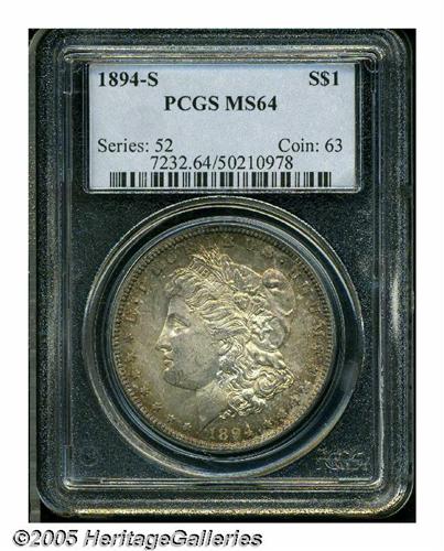 <B>1894-S<S$1> MS64 PCGS.</B></I> A lovely near-Gem with reflective fields and sharp design features, all beneath rich gold, cobalt, and iridescent toning.