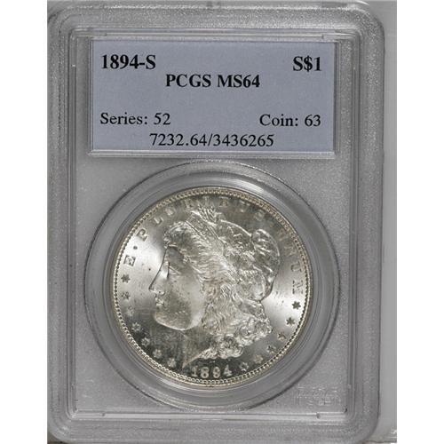 <B>1894-S<img border='0' src='http://www.heritagecoins.com/images/star.gif' width=10 height=10>$1> MS64 PCGS.</B></I> A nicely struck and refreshingly unabraded near-Gem. Vibrant cartwheel luster illuminates the snow-white, untoned surfaces. Notoriously scarce in better circulated grades, the 1894-S is also scarce in Mint State and is rarely encountered any finer than the present piece.