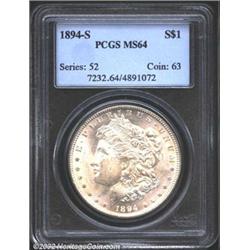 1894-S S$1 MS64 PCGS. Both sides have wisps of dusky tan patina. A flashy and somewhat prooflike nea