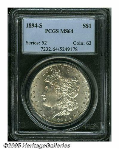 <B>1894-S<S$1> MS64 PCGS.</B></I> Dashes of golden-brown and lilac color visit this otherwise untoned near-Gem. Lustrous and reasonably struck, the reverse and the cheek are well preserved.